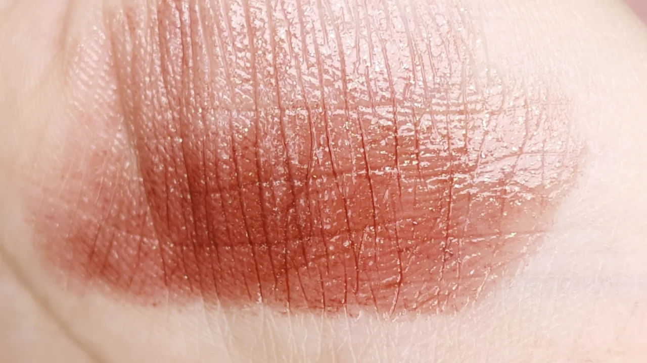 ラメ入りですがザラザラ感はなし。ブラウンベースなので、意外と派手になりすぎず使いやすいです。唇の中心側のみに部分使いしてもかわいい。